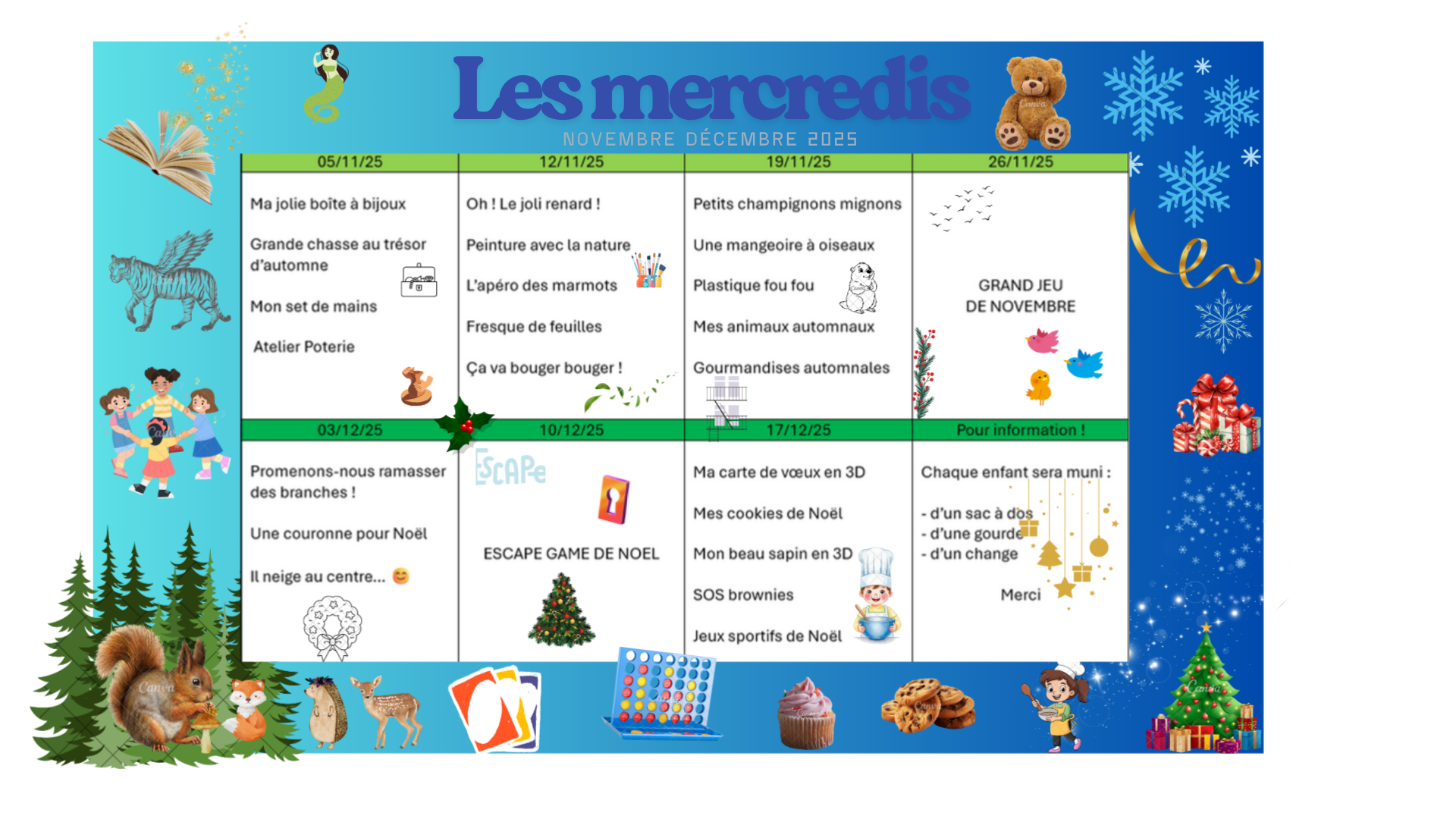 Vacances de Noël 2025 (centre seulement ouvert la 1ère semaine des vacances)