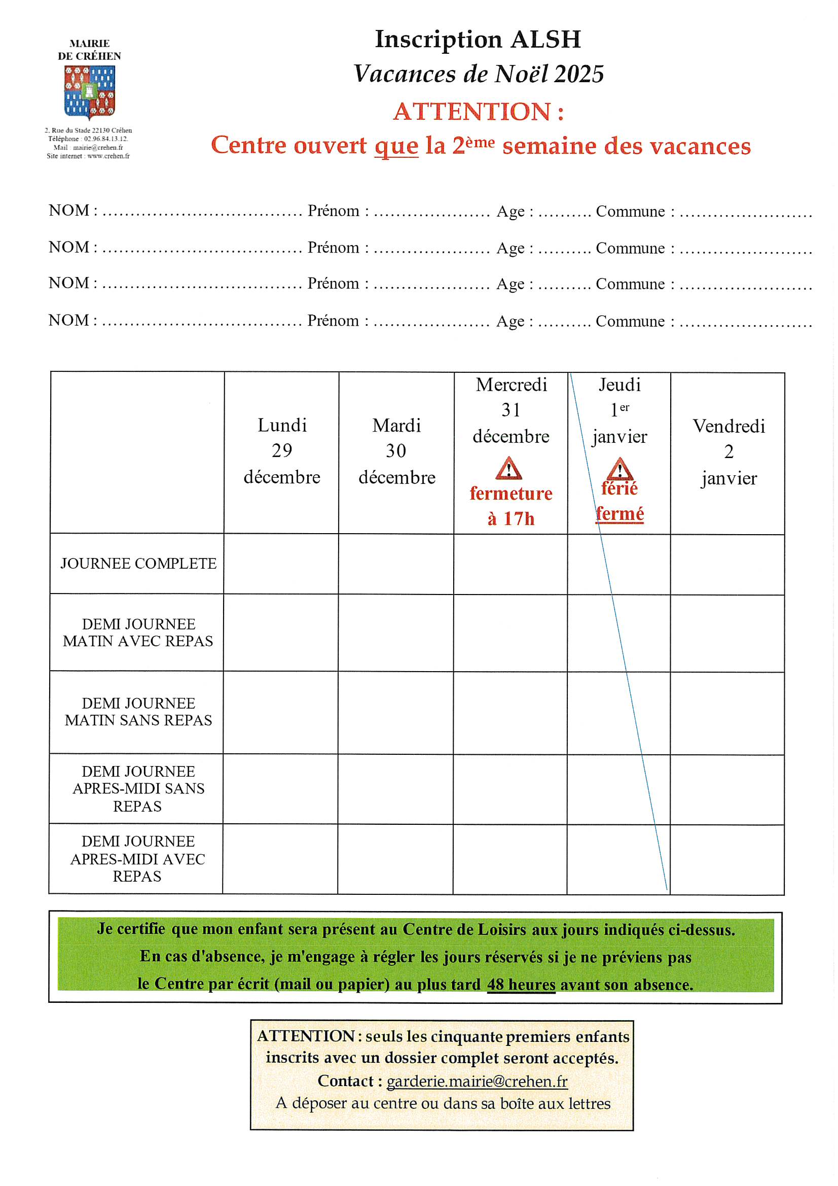 Pour tout renseignement, merci de contacter Laurence ou Benoît au 07.85.35.73.64 ou par mail : garderie.mairie@crehen.fr
