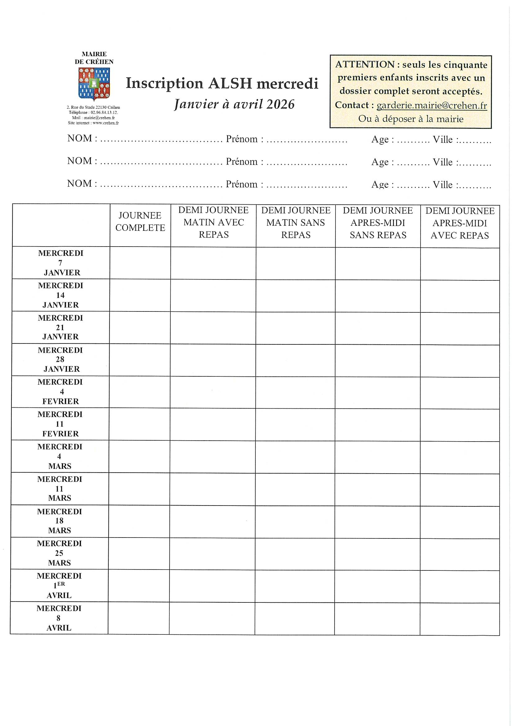 Pour tout renseignement, merci de contacter Laurence ou Benoît au 07.85.35.73.64 ou par mail : garderie.mairie@crehen.fr